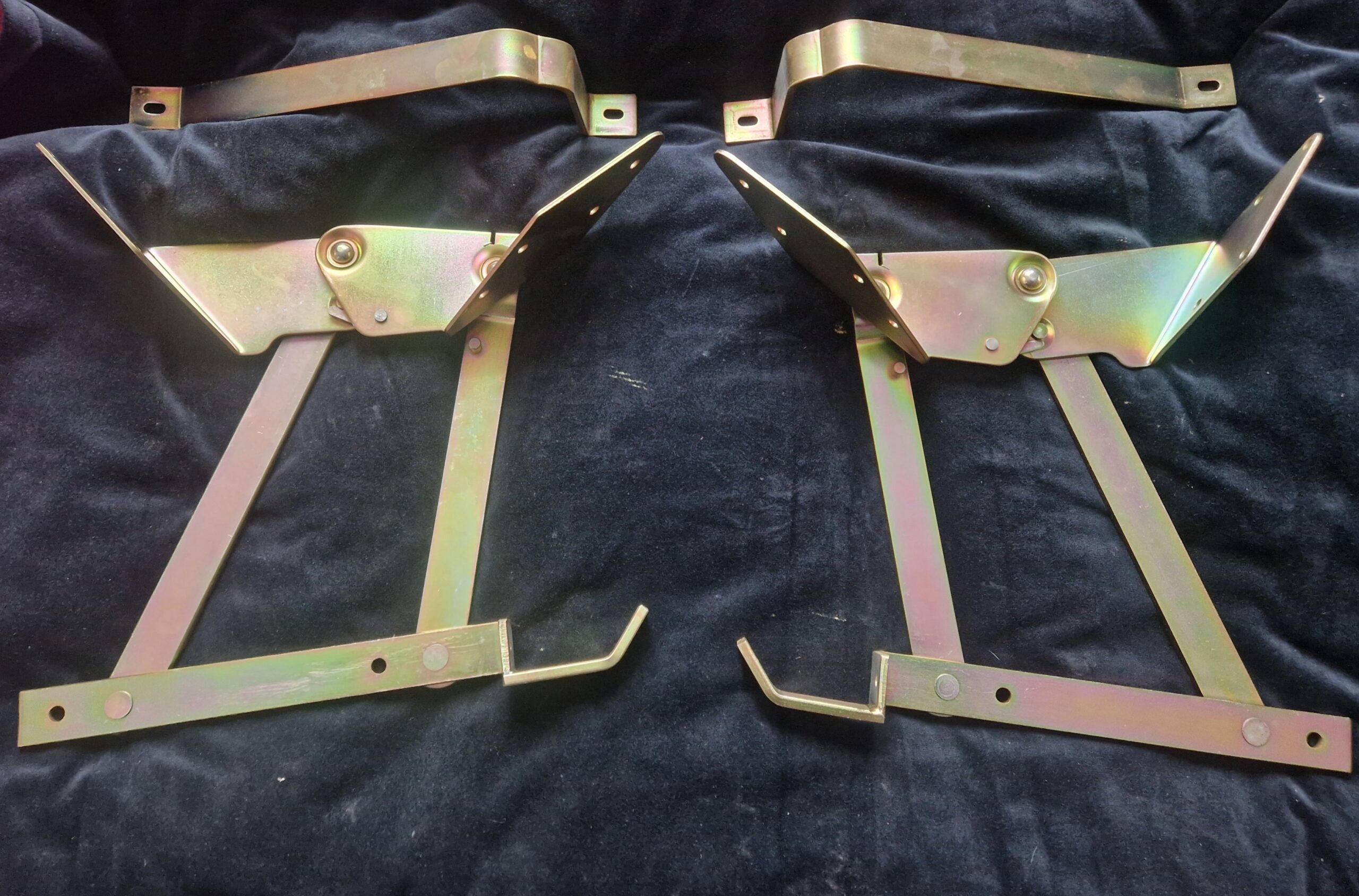 VW T3 Raised Bed Rock and Roll Bed Hinges raised engine compartment platform 255 070 885 Excellent Aftermarket reproduction. In our humble opinion one of the best things you can do to your van to gain space over your engine hatch for tables, tools, and spare parts etc. Compatible with Westfalia units and an ideal upgrade to gain 12-14cm over the engine hatch. will also suit vertical engine installs where you need to raise the engine hatch. The hinge raises the sleeping platform approximately 12-14 cm above the engine compartment and you will need to constuct a platform to suit. By modifying the hinges, a height increase of more than 14 cm is also possible for thiose who want to go higher. Set consists of 1 hinge on the left and right and 2 support brackets for the seat. Also suitable for t1 and t2 buses.